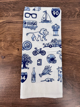 Blue and white Chicago Icons Dish Towel featuring classic city landmarks and symbols | JSQ Mercantile – Women’s Boutique & Gift Shop in La Grange, IL