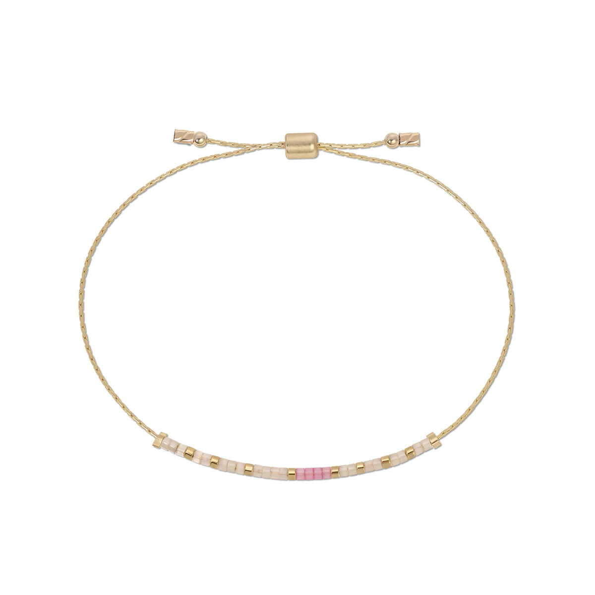 This beautiful bracelet celebrates moms raising girls with a design that encodes the words 'Girl Mama' into a Morse code design with neutral colors and a hint of pink.
