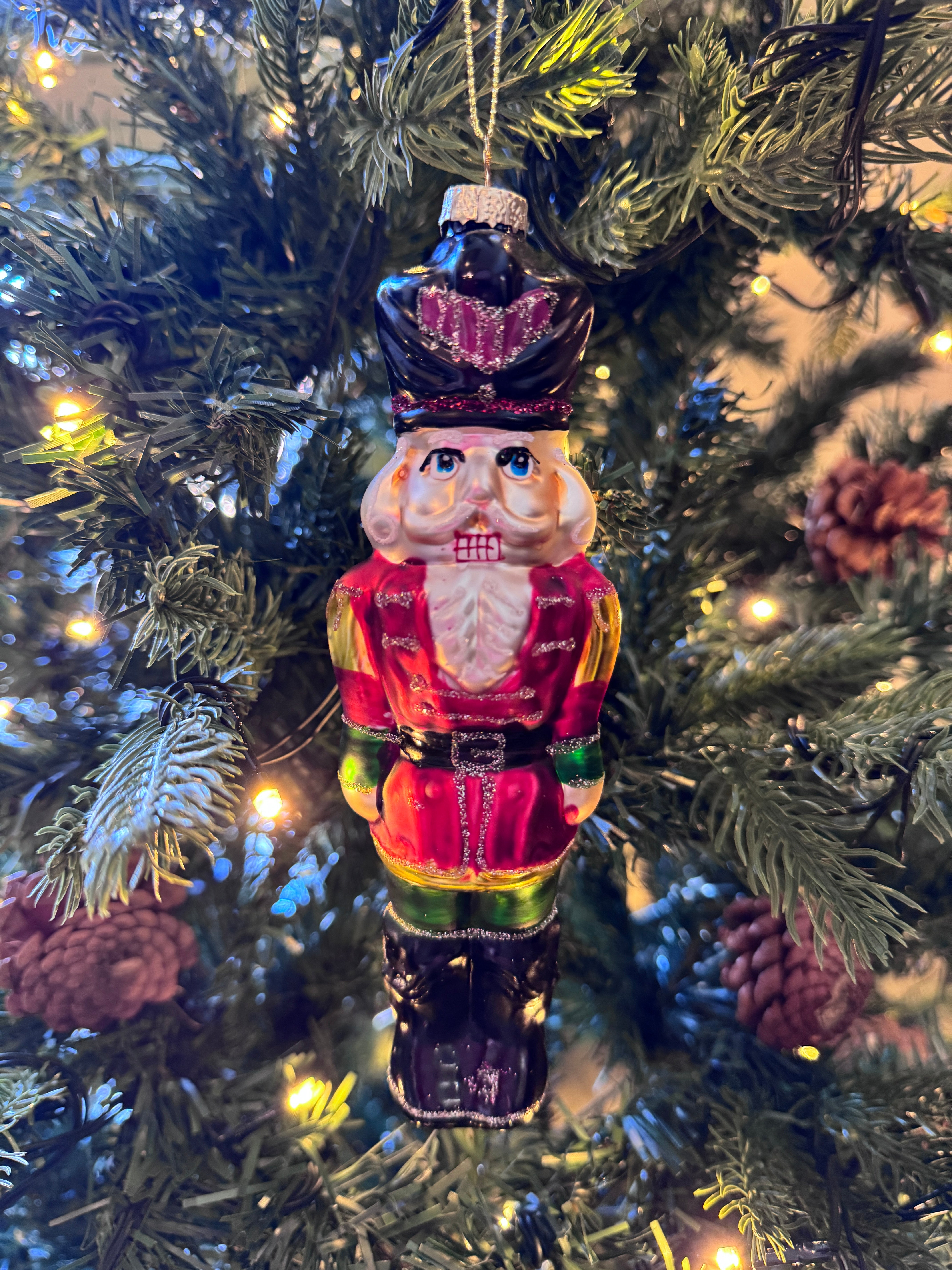 Hand-blown and hand-painted with care, this timeless nutcracker design features a vibrant red jacket trimmed in green, a black hat and boots, and a gold cap with loop for easy hanging. Each detail reflects old-world craftsmanship, making it a cherished keepsake you’ll enjoy year after year.