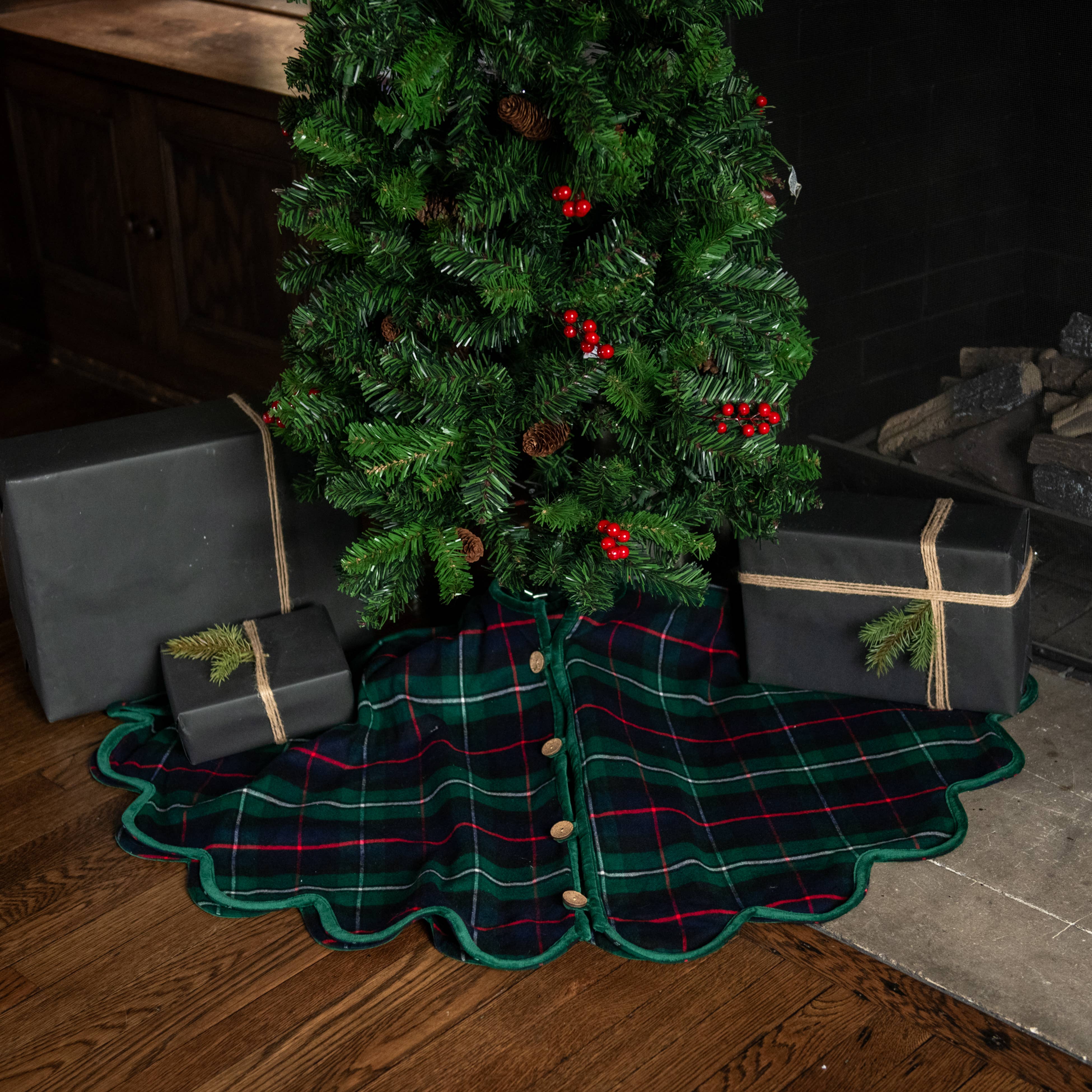 This timeless tree skirt features a traditional green tartan plaid pattern accented with a softly scalloped edge, creating a warm and inviting look for your Christmas décor. Generously sized to fit under most trees, it provides the perfect finishing touch while neatly concealing your tree stand and cords.