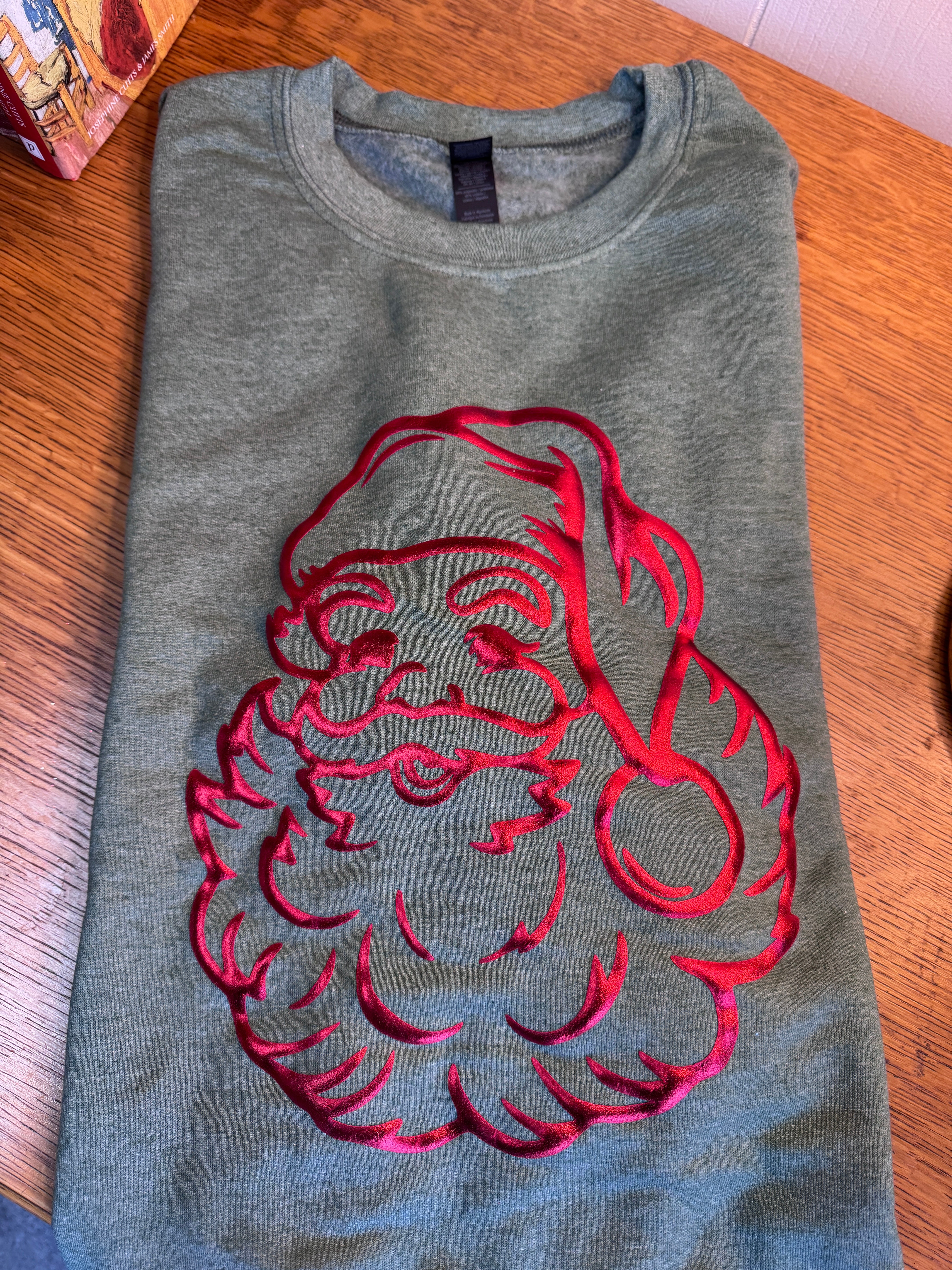 Green Sweatshirt with Metallic Red Vintage Santa Face
