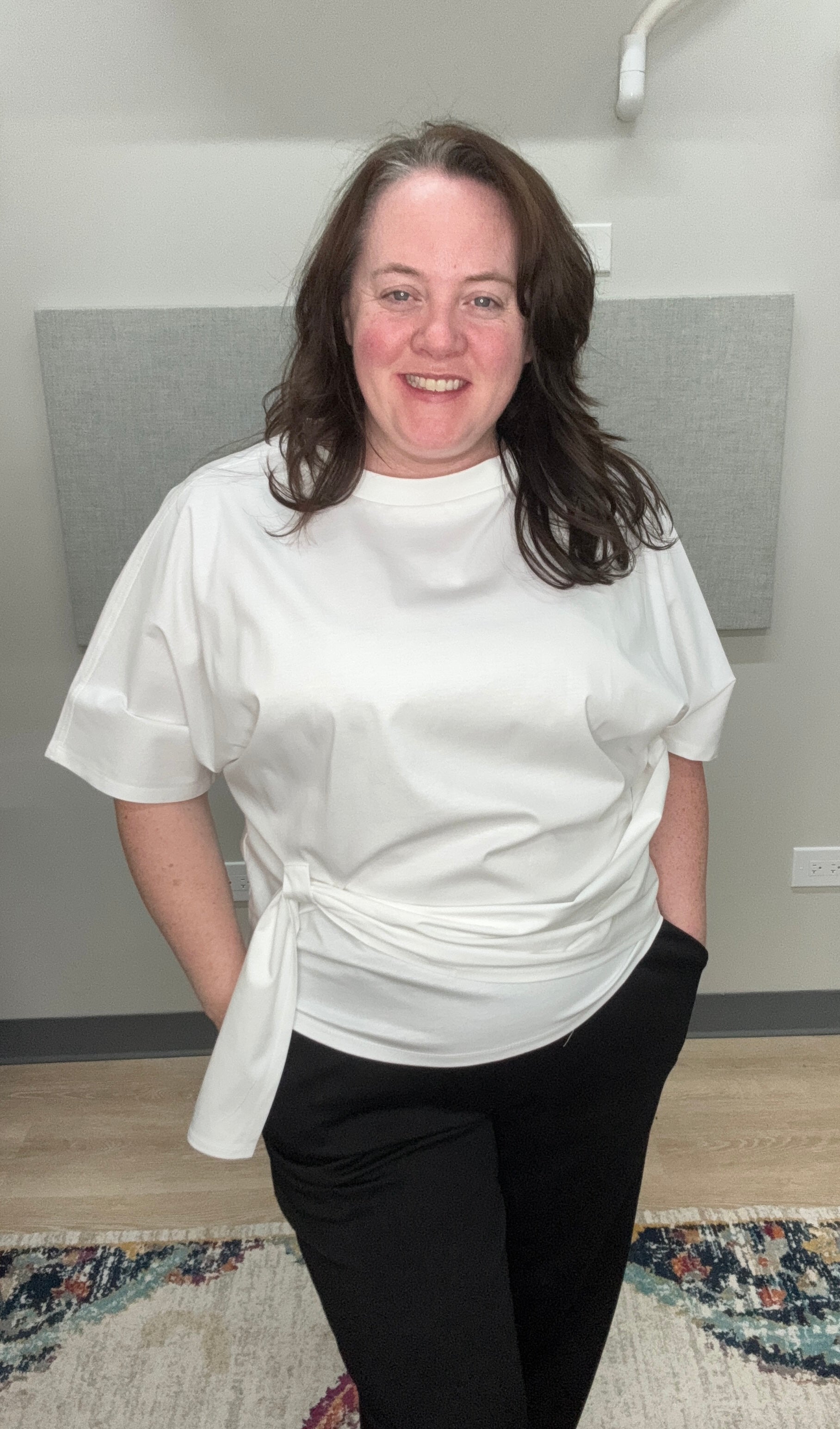 The relaxed silhouette drapes effortlessly, while the waist tie lets you customize your shape — wear it cinched for a polished look or looser for laid-back ease. Perfect with denim, tailored trousers, or paired with sleek lounge pants for a monochromatic moment.