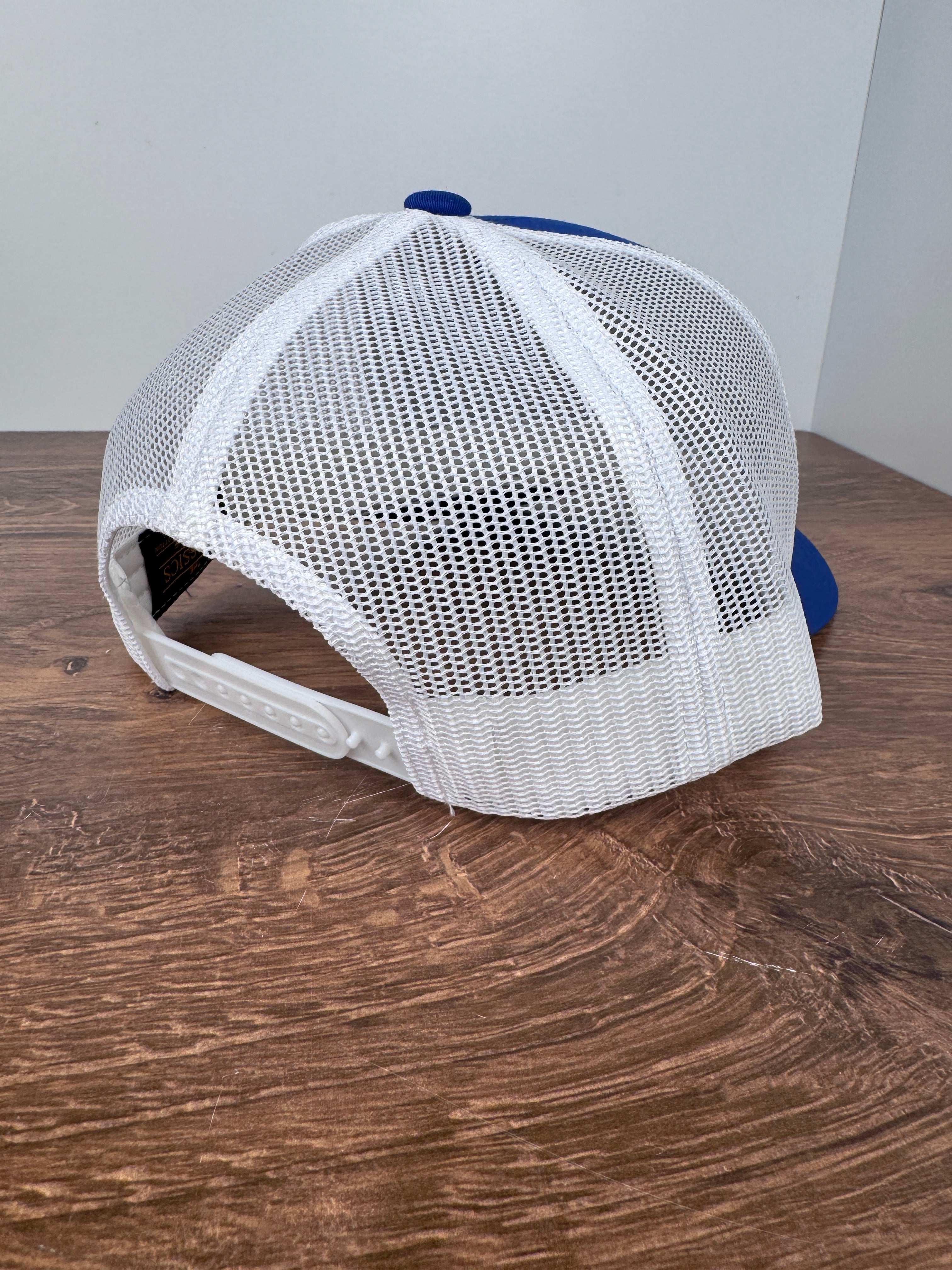 Blue cotton front with white mesh back for breathability